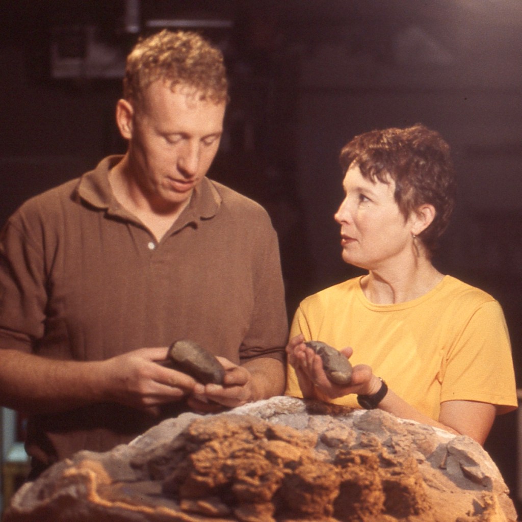 Dr. David J. Varricchio et Paula Salvador tiennent des oeufs de Troödon au Museum of the Rockies, Montana.